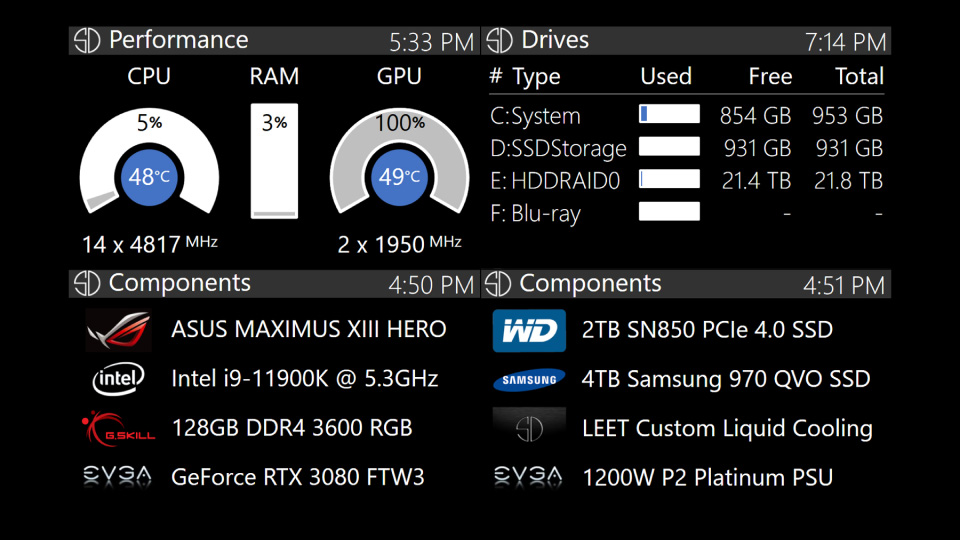 Take full control with LEET’s integrated 7” front display and light-weight LEET Monitor App. It shows vital system parameters including audio volume, system uptime, drive space, memory utilization, CPU/GPU clocks, load levels, temperatures, and hardware components.
