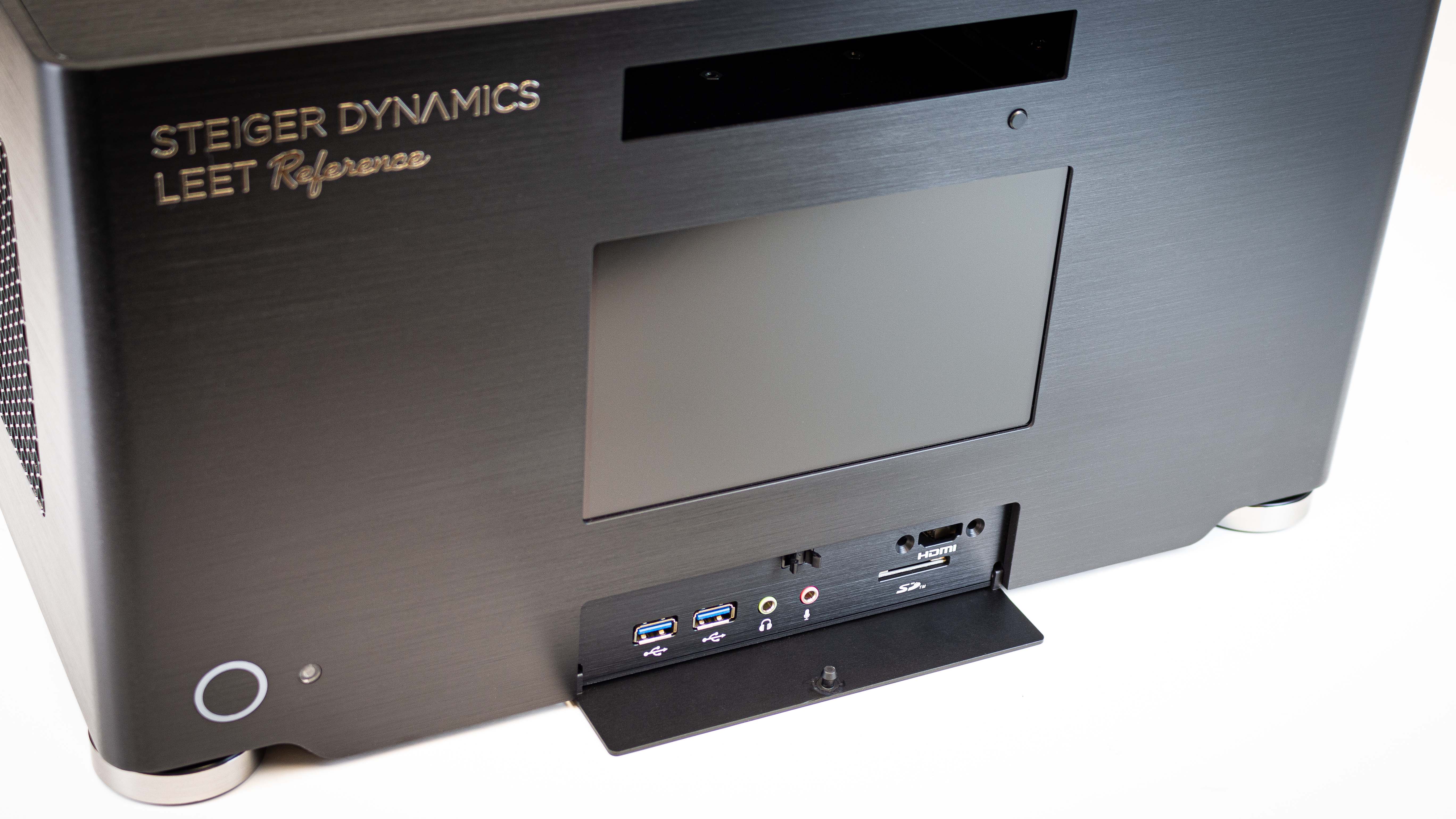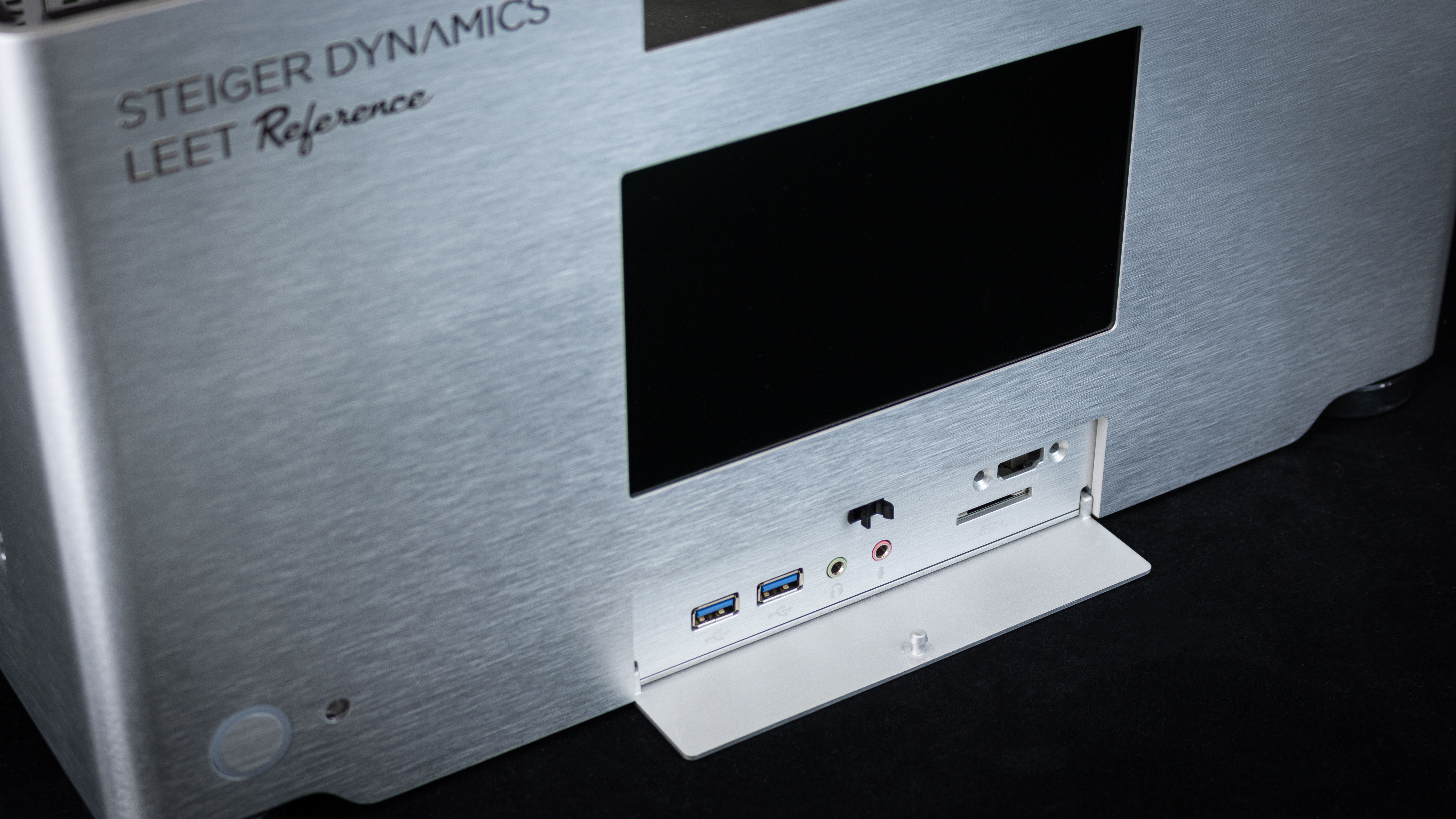 The LEET Chassis front panel is hidden behind a down-folding brushed aluminum door, unobtrusively integrated into the chassis design. The front panel provides the following connectivity options: