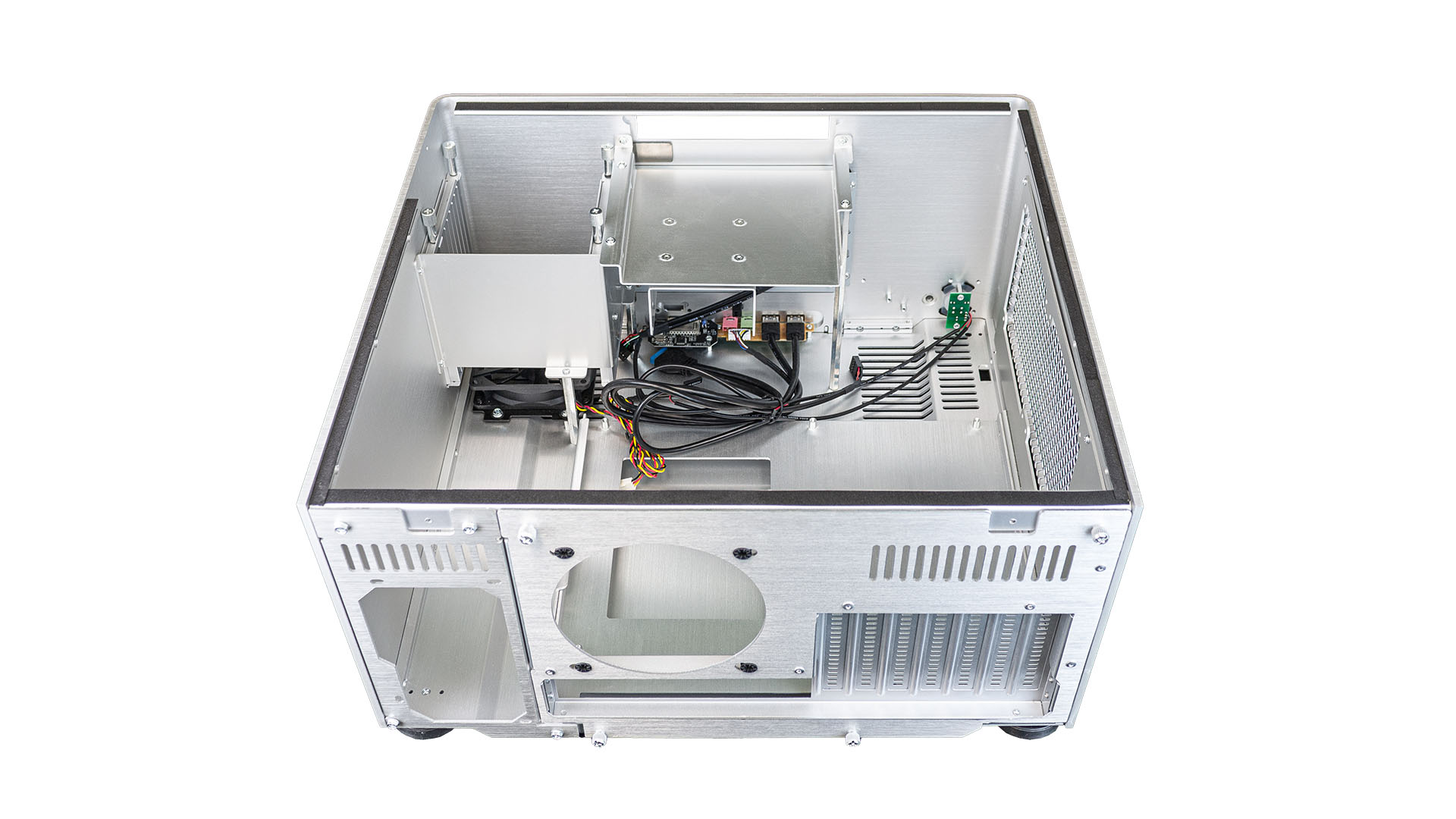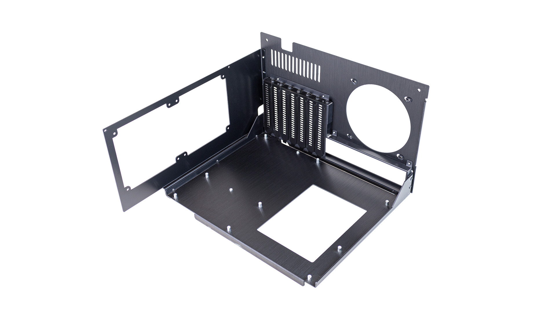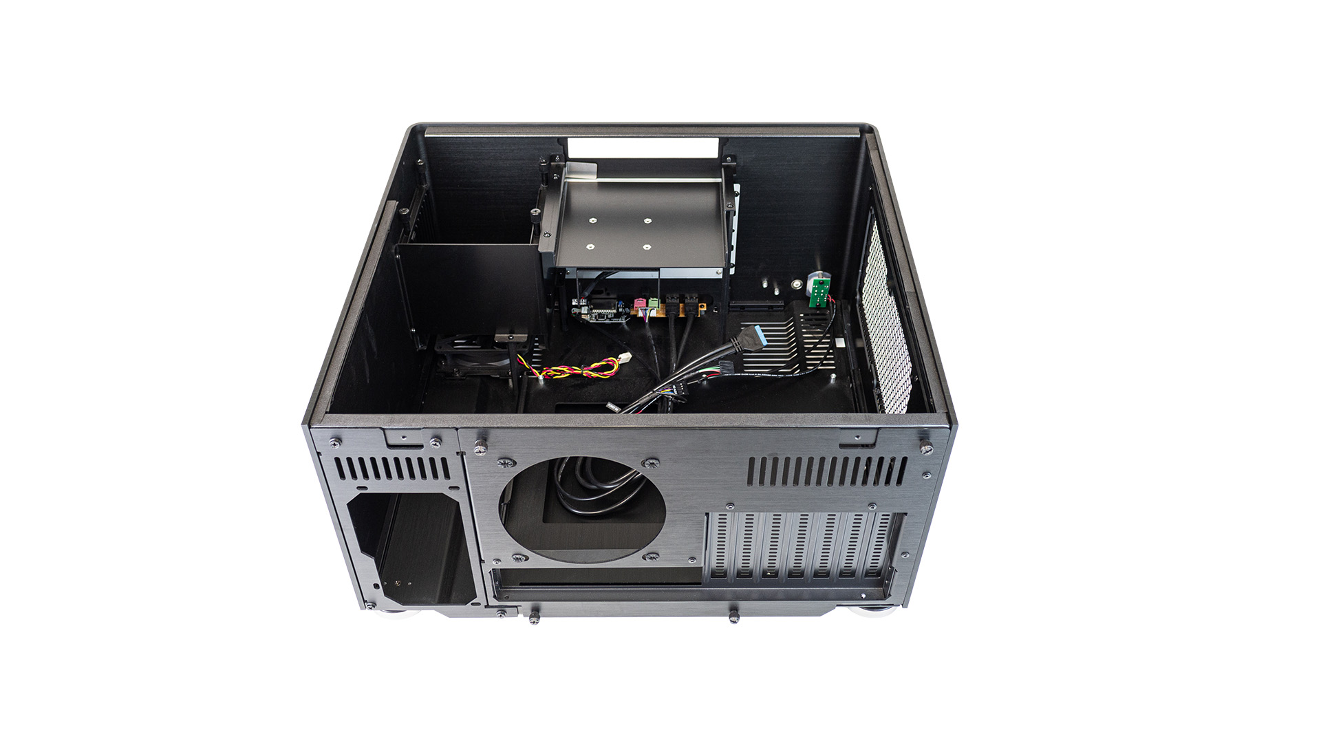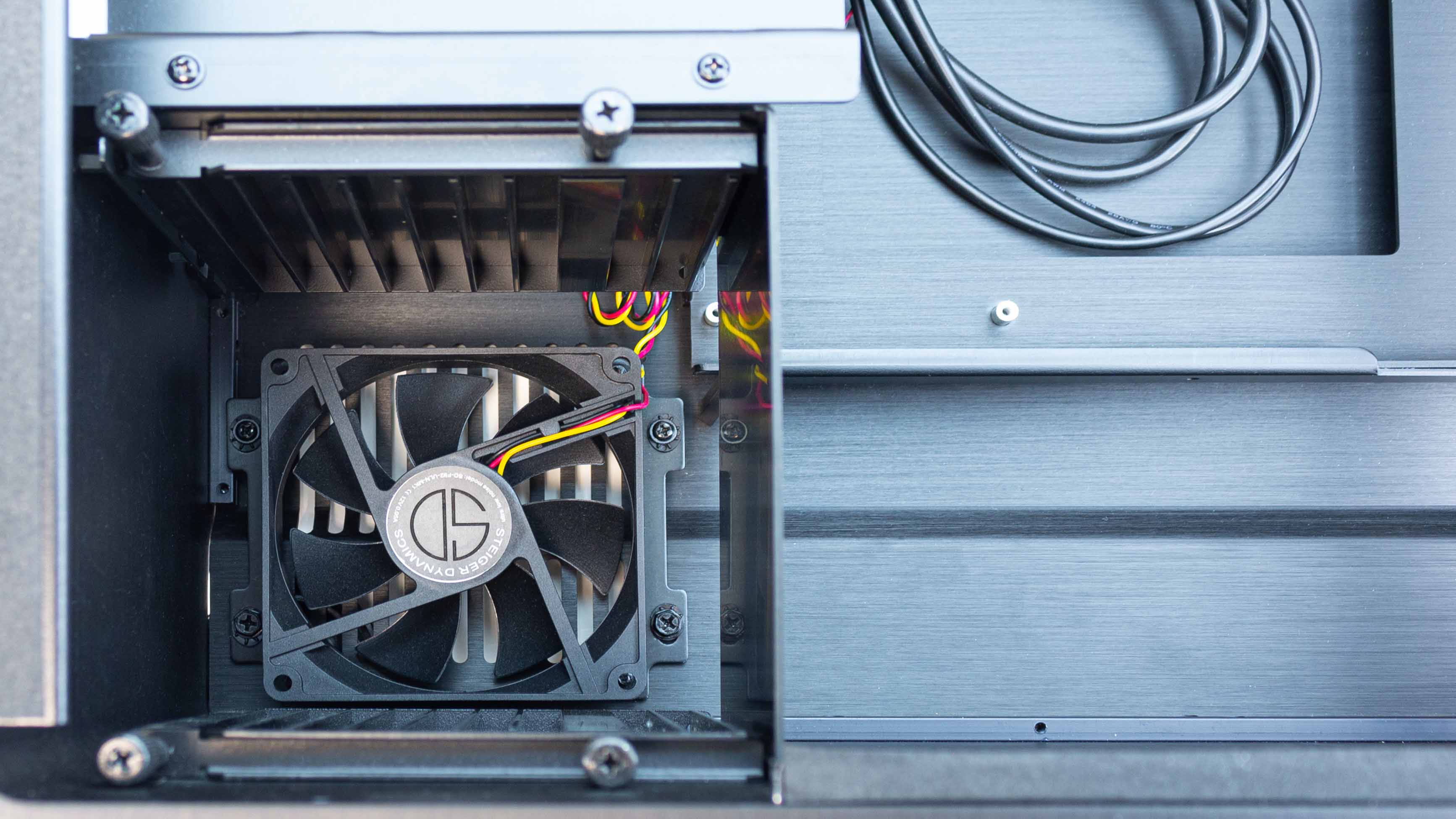 LEET Chassis can hold 4x 3.5” HDDs, mounted on a vibration-reduction system and cooled by a 92mm fan. Three additional 2.5” drives can be installed below the optical drive tray.